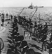 Photo #: NH 82636 USS Iowa (Battleship # 4) Ship's Marines drilling on deck with rifles and bayonets, 1898. The original photograph was printed on a stereograph card, copyright 1899 by Strohmeyer & Wyman, New York. Courtesy of Captain George Atkins, USNR (DC), 1975 U.S. Naval Historical Center Photograph. Online Image: 134KB; 630 x 675 pixels A stereo pair version of this image is available as Photo # NH 82636-A Online Image of stereo pair: 89KB; 675 x 360 pixels |