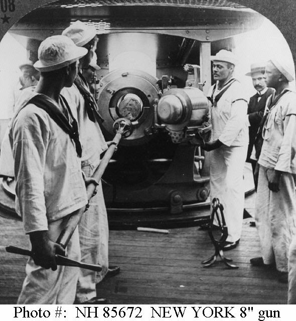 Photo #: NH 85672 USS New York (CA-2) Practice loading of one of the cruiser's midships 8"/35 guns, circa 1898. The original photograph was published on a stereograph card by the Keystone View Co. in about 1918. Courtesy of Captain George Atkins, USNR(DC), 1977. U.S. Naval Historical Center Photograph. Online Image: 66,900 bytes; 590 x 640 pixels A sterep pair version of this image is available as Photo # NH 85672-A Online Image of stereo pair: 53,361 bytes; 675 x 375 pixels |