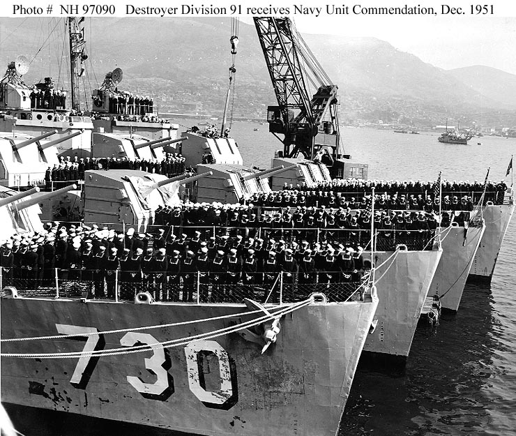 "Men of Destroyer Division 91 crowd the foc'sle and superstructure