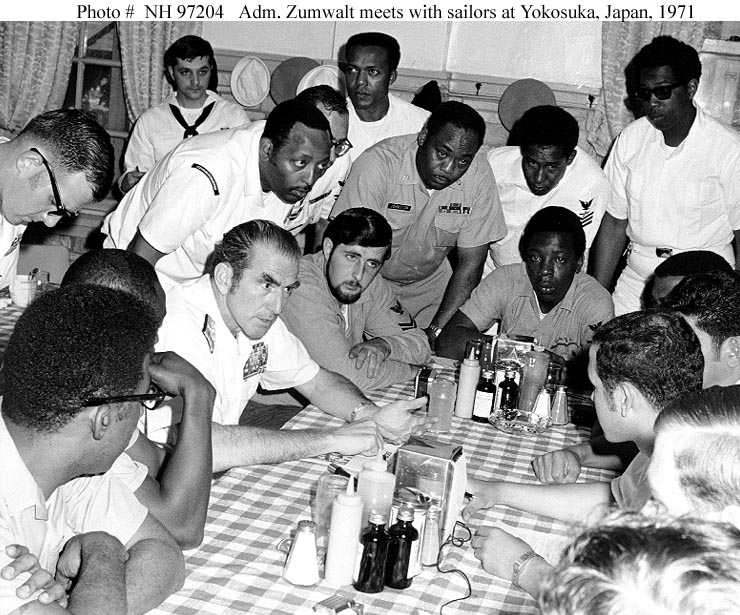Photo #: NH 97204 Admiral Elmo R. Zumwalt, Jr., USN, Chief of Naval Operations (seated, third from left) Speaks with the Human Relations Council, at Fleet Activities, Yokosuka, Japan, 2 July 1971. Photographed by PH2 Edward C. Mucma. Official U.S. Navy Photograph, from the collections of the Naval History and Heritage Command. Online Image: 137KB; 740 x 615 pixels |