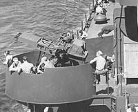 Photo #: NH 97963 (cropped) 1.1-inch quad anti-aircraft machinegun mounting Located on the starboard side amidships of USS Nashville (CL-43). Photographed 11-13 May 1943, before or just after the 13 May bombardment of Japanese positions on Kolombangara and New Georgia islands. Note the metal shroud installed around the barrels of this gun mount. This view is cropped from Photo # NH 97963. Official U.S. Navy Photograph, from the collections of the Naval Historical Center. Online Image: 91KB; 740 x 625 pixels |