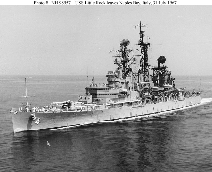 Leaving Naples Bay, Italy, on 31 July 1967, while serving as flagship of the Sixth Fleet.