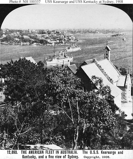 Photo #: NH 100337 "Great White Fleet" Cruise around the World, 1907-1909 Battleships of the U.S. Atlantic Fleet in Sydney Harbor, Australia, in late August 1908. USS Kearsarge (Battleship # 5) is in the center, with USS Kentucky (Battleship # 6) beyond. The original photograph was published on a stereograph card by the Rose Stereograph Company, Melbourne, Sydney, Wellington & London. Donation of Louis Smaus, 1985 U.S. Naval Historical Center Photograph. Online Image: 120KB; 565 x 675 pixels A stereo pair version of this image is available as Photo # NH 100337-A Online Image of stereo pair: 86KB; 675 x 400 pixels |