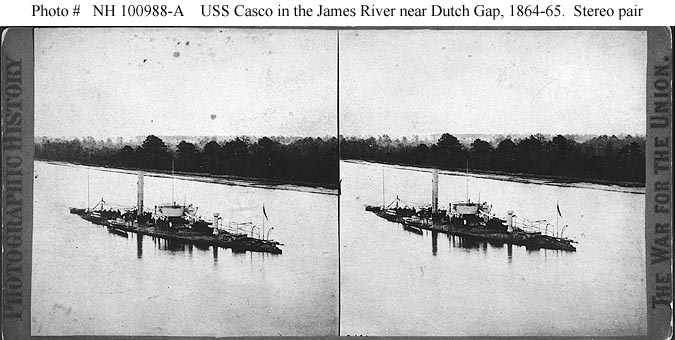 Photo #: NH 100988 USS Casco (1864-1875) Serving as a torpedo boat on the James River, Virginia, near Dutch Gap, in 1864-1865. Note the spar torpedo gear carried at her bow, and the XI-inch Dahlgren smoothbore gun pivit-mounted on deck. Photo mounted on a stereograph card, published by E. & H.T. Anthony & Company, New York. Courtesy of Louis H. Smaus, 1986. U.S. Naval Historical Center Photograph. Online Image: 95KB; 645 x 675 pixels A stereo pair version of this image is available as Photo # NH 100988-A Online Image of stereo pair: 55KB; 675 x 340 pixels |