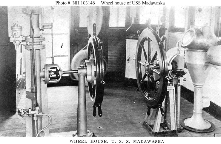 the interior of the ship's wheel house. Note the gearing and