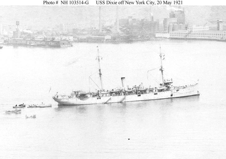 Photo #: NH 103514-G USS Dixie (AD-1) In the North River off New York City, 20 May 1921. Cropped from NH 103514, a panoramic photograph by Himmel and Tyner, New York. U.S. Naval Historical Center Photograph. Online Image: 48KB; 740 x 520 pixels |