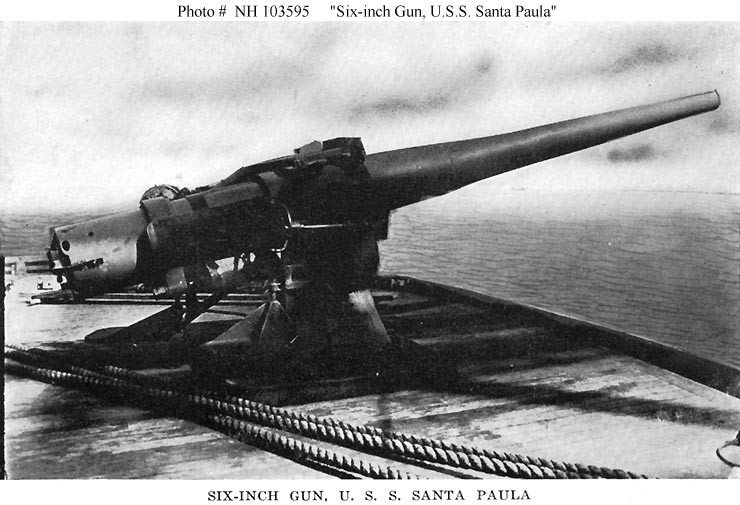 Photo #: NH 103595 USS Santa Paula (ID # 1590) Halftone reproduction of a photograph taken in 1919, showing a six-inch gun identified as being mounted on board the ship. This image, whose background has been heavily retouched, is one of ten photographs published in a "Souvenir Folder" of views concerning USS Santa Paula. It is a different view that shown in Photo # NH 103315, which was printed in an otherwise identical Santa Paula "Souvenir Folder". Donation of Dr. Mark Kulikowski, 2005. U.S. Naval Historical Center Photograph. Online Image: 74KB; 740 x 505 pixels |