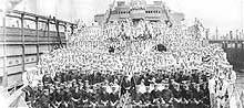 Ship's Officers and Crew pose on her foredeck, at Hoboken, New