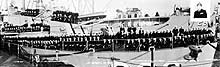 Panoramic photograph of the ship's officers and crew, taken at the Destroyer-Submarine Piers, Norfolk Naval Base, Virginia, 11 February 1959.