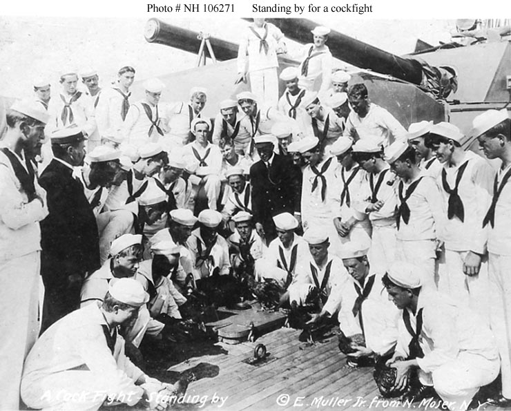 Crew members of a U.S. Navy battleship prepare to release their fighting poultry, circa the early or middle 1910s.