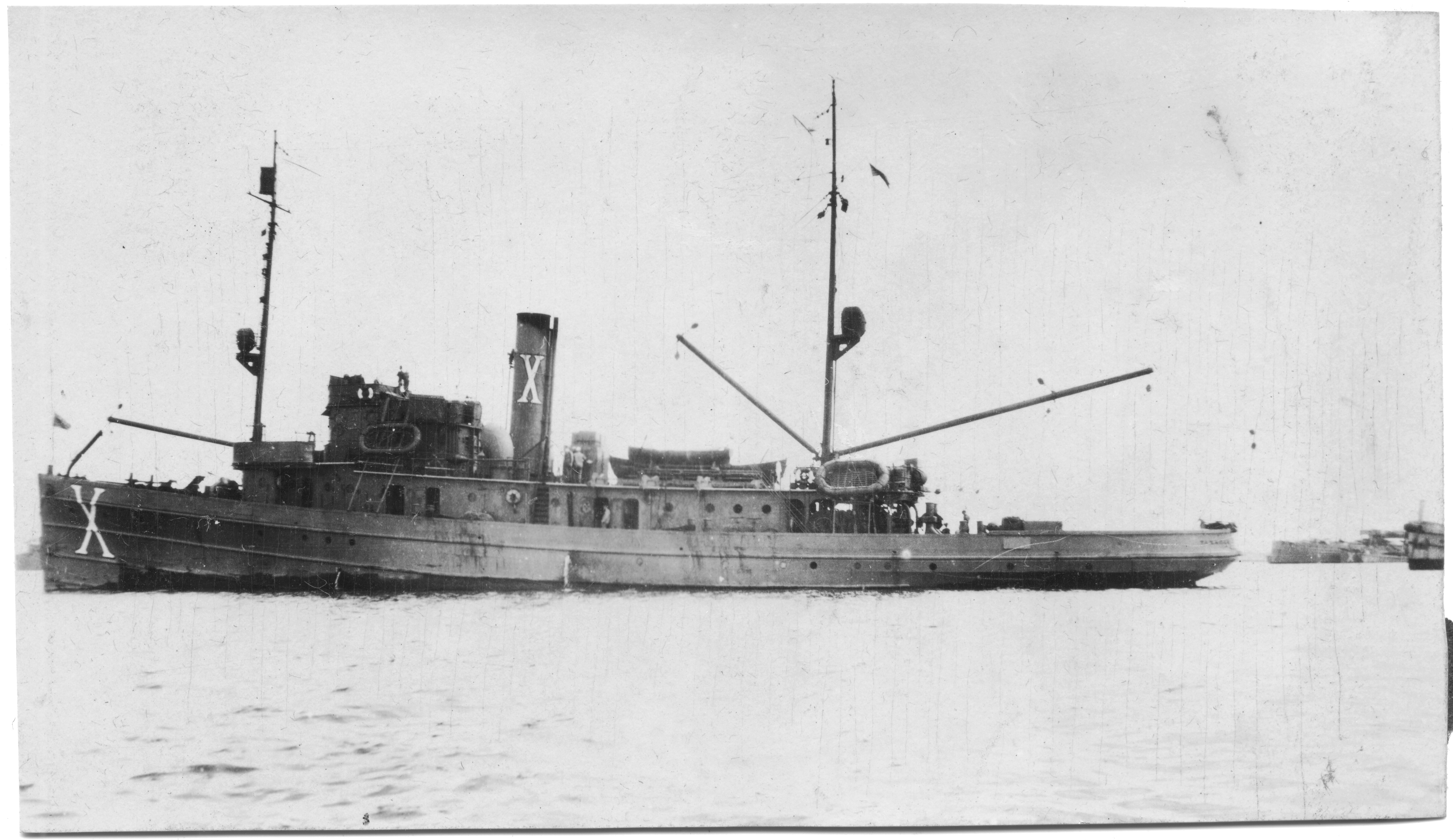 Photo #: NH 107315 USS Tanager (Minesweeper # 5) In port during North Sea Mine Barrage clearance operations, circa mid-1919. She wears "X" as an identification mark on her bow and smokestack. Another vessel, part of a group of ships partially visible in the right distance, also has an "X" painted on her bow. The original photograph is in the USS Tanager collection (Lot # S-590, page 1). Donation of Dr. Mark Kulikowski, 2010. U.S. Naval History and Heritage Command Photograph. Online Image: 55 KB; 900 x 535 pixels |