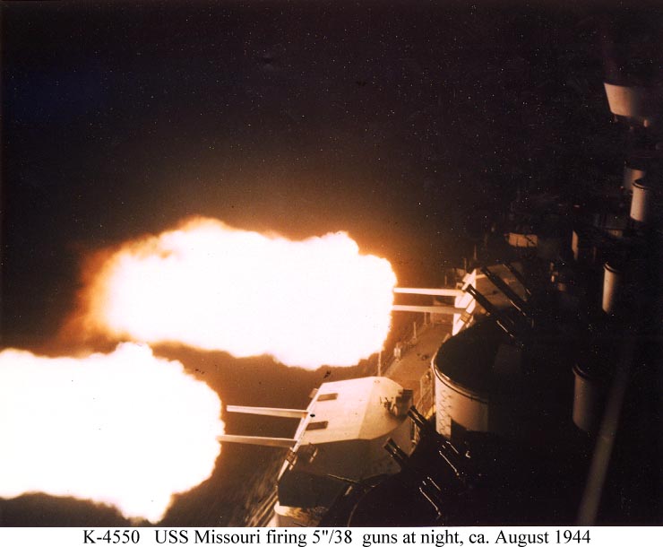 Photo #: 80-G-K-4550 (Color) USS Missouri (BB-63) Fires her 5"/38 secondary battery during a shakedown cruise night gunnery practice, circa August 1944. Official U.S. Navy Photograph, now in the collections of the U.S. National Archives. Online Image: 53KB; 740 x 610 pixels Reproductions of this image may also be available through the National Archives photographic reproduction system. |