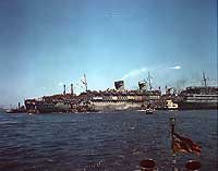 Photo #: 80-G-K-5778 (Color) USS West Point (AP-23) Receives the assistance of tugs as she docks at Navy Pier, New York City, upon her arrival with troops returning to the U.S. from Europe, 11 July 1945. Banners hanging from her superstructure identify the following U.S. Army units (from left to right): Note West Point's pattern camouflage. Official U.S. Navy Photograph, now in the collections of the National Archives. Online Image: 73KB; 740 x 605 pixels Reproductions of this image may also be available through the National Archives photographic reproduction system. |