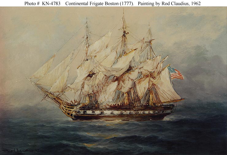 Photo #: KN-4783 (Color) Continental Frigate Boston (1777-1780) Painting by Rod Claudius, Rome, Italy, 1962. This artwork was made for display on board USS Boston (CAG-1). Photographed by PHCS G.R. Phelps, Boston Naval Shipyard, 10 April 1963. Official U.S. Navy Photograph. Online Image: 71KB; 740 x 505 pixels Reproductions of this image may also be available through the National Archives photographic reproduction system. |