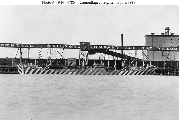 Photo #: 19-N-14786 "Dazzle" camouflaged freighter In port, 1918, probably on the lower Mississippi River. The original photo caption identifies this ship as USS Berwyn (ID # 3565), but that vessel did not visit the Gulf area during her World War I era Navy service. Berwyn also differed in many details from the ship seen here (see Photo # NH 64594-A). Photograph from the Bureau of Ships Collection in the U.S. National Archives. Online Image: 67KB; 740 x 495 pixels Reproductions of this image may also be available through the National Archives photographic reproduction system. |