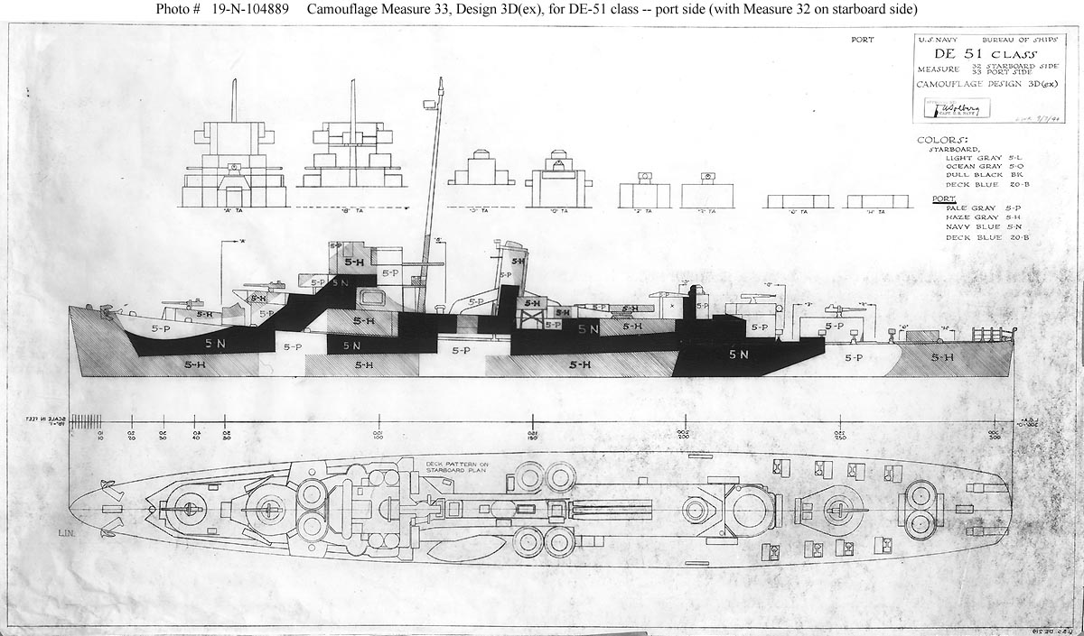 Photo #: 19-N-104889 Camouflage Measure 33, Design 3D(ex) Drawing prepared by the Bureau of Ships for a camouflage scheme intended for escort ships of the Buckley (DE-51) class. This plan, approved by Captain Torvald A. Solberg, USN, is dated 7 September 1944. It shows the ship's port side. Note that this camouflage scheme calls for painting the ship's starboard side in the darker tones of Measure 32. Photograph from the Bureau of Ships Collection in the U.S. National Archives. Online Image: 153KB; 1200 x 705 pixels Reproductions of this image may also be available through the National Archives photographic reproduction system. |