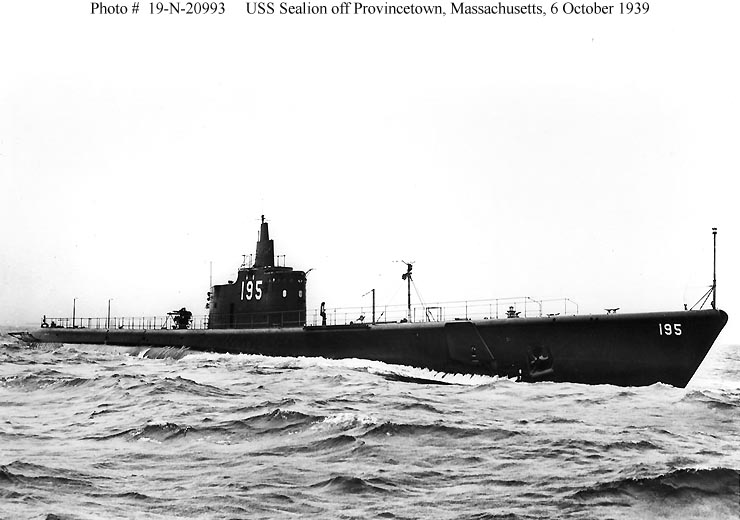 Photo #: 19-N-20993 USS Sealion (SS-195) Off Provincetown, Massachusetts, during trials, 6 October 1939. Photograph from the Bureau of Ships Collection in the U.S. National Archives. Online Image: 62KB; 740 x 520 pixels Reproductions of this image may also be available through the National Archives photographic reproduction system. |