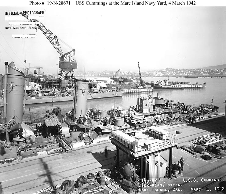 Photo #: 19-N-28671 USS Cummings (DD-365) Plan view, aft, taken at the Mare Island Navy Yard, California, 4 March 1942. Cummings' midships torpedo tubes are trained out to port, and the small tug Despatch # 6 is alongside to starboard. USS Selfridge is partially visible in the background, and a submarine is under construction beyond Crane # 4 in the left distance. Note the searchlight in the center foreground. Photograph from the Bureau of Ships Collection in the U.S. National Archives. Online Image: 135KB; 740 x 635 pixels Reproductions of this image may also be available through the National Archives photographic reproduction system. |