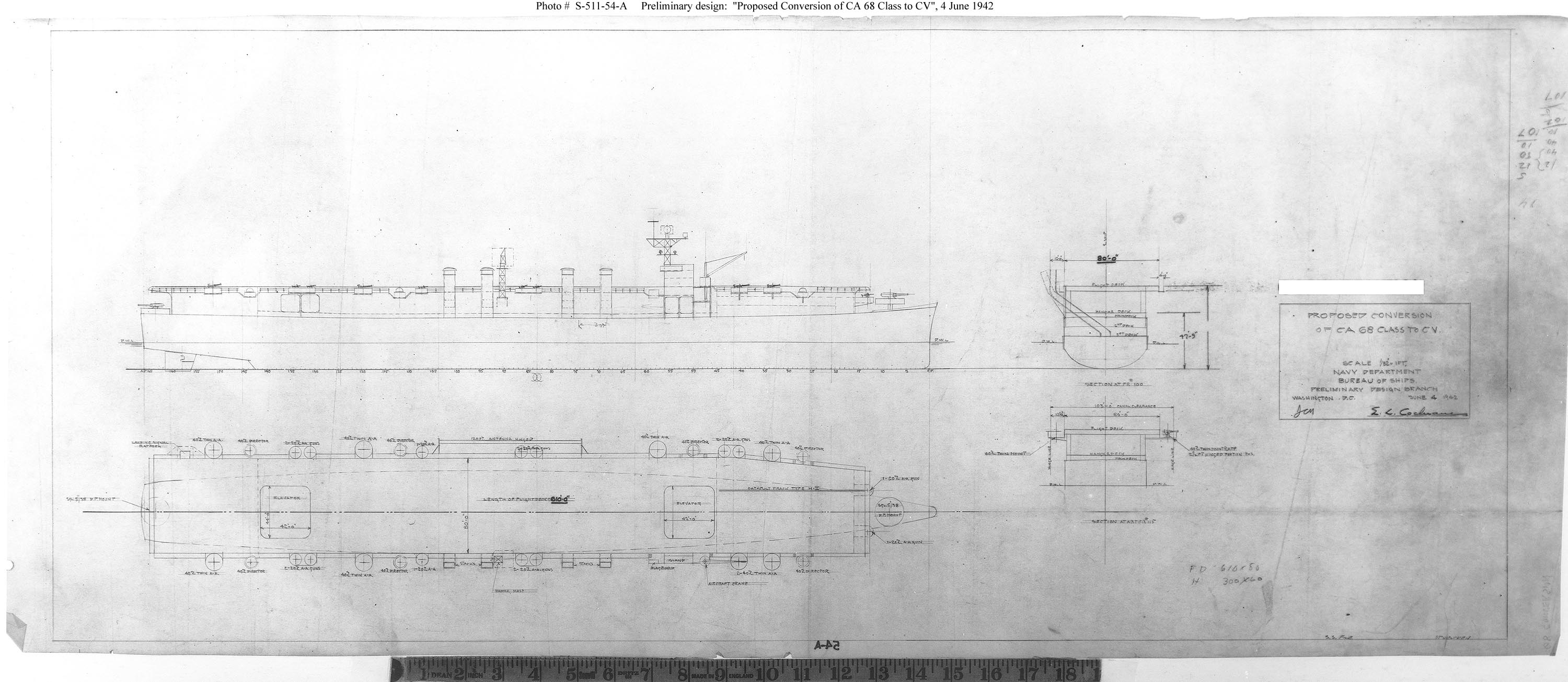 Photo #: S-511-54-A "Proposed Conversion of CA 68 Class to CV" Preliminary design plan prepared for the General Board during consideration of aircraft carrier conversions of other types of warships. This plan, dated 4 June 1942 (the date of the Battle of Midway!), depicts a ship generally similar to the later Saipan (CVL-48) class, but with less freeboard. Scale of the original drawings is 1/32" = 1'. The original plan is in the 1939-1944 "Spring Styles Book" held by the Naval Historical Center. U.S. Naval Historical Center Photograph. Online Image: 401KB; 3000 x 1305 pixels |