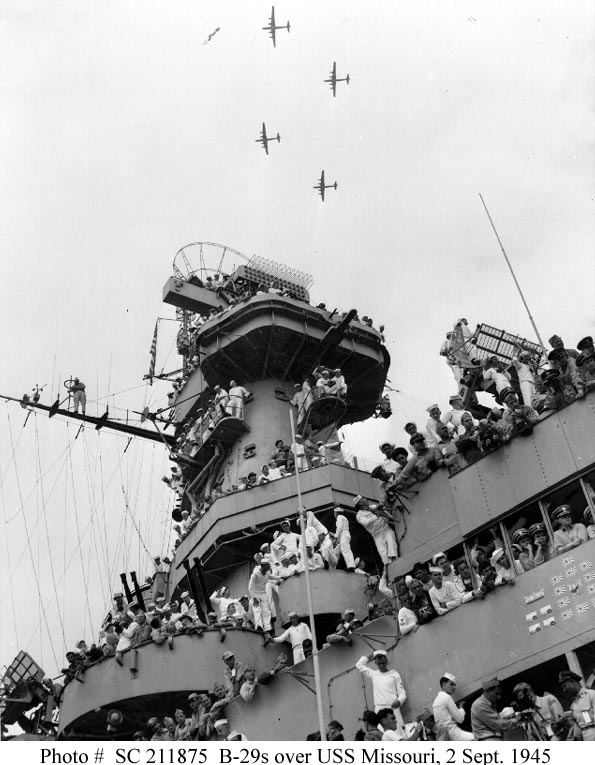 Photo #: SC 211875 Surrender of Japan, Tokyo Bay, 2 September 1945 USAAF B-29 bombers fly in formation over USS Missouri (BB-63), during the surrender ceremonies, 2 September 1945. Photographed from on board the ship, looking up past her forward superstructure, which is crowded with spectators and photographers. Photograph from the Army Signal Corps Collection in the U.S. National Archives. Online Image: 86KB; 595 x 765 pixels Reproductions of this image may also be available through the National Archives photographic reproduction system. |