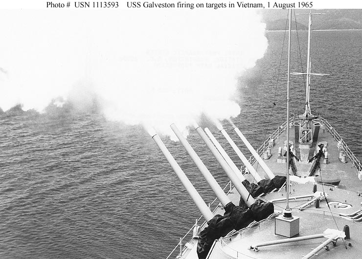 Photo #: USN 1113593 USS Galveston (CLG-3) Fires her 6"/47 guns at maximum range, during shore bombardment operations off Vietnam, 1 August 1965. Photographed by D.B. Jackson. Official U.S. Navy Photograph. Online Image: 95KB; 740 x 530 pixels Reproductions of this image may also be available through the National Archives photographic reproduction system as Photo # 428-N-1113593. |