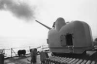 Photo #: USN 1133001 USS Turner Joy (DD-951) Firing one of her three 5"/54 Mark 42 gun mounts (Mount 52) toward an enemy shore position in Vietnam, 20 June 1968. Note the ejected powder canister flying through the air in front of the gun mount, and other powder canisters stacked on deck in the foreground. Photographed by JO1 Willard B. Bass, Jr., USN. Official U.S. Navy Photograph. Online Image: 63KB; 740 x 515 pixels Reproductions of this image may also be available through the National Archives photographic reproduction system as Photo # 428-N-1133001. |