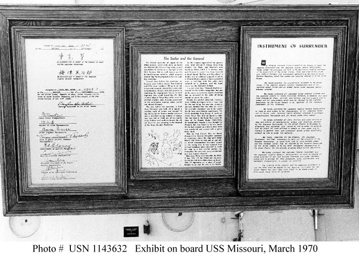 Photo #: USN 1143632 USS Missouri (BB-63) Exhibit featuring copies of the Japanese Instrument of Surrender and an article, entitled The Sailor and the General, concerning preparations for the surrender ceremonies held on board Missouri on 2 September 1945. Photographed on board the ship, at the Bremerton, Washington, Reserve Fleet facility, 19 March 1970. Official U.S. Navy Photograph. Online Image: 123KB; 740 x 525 pixels Reproductions of this image may also be available through the National Archives photographic reproduction system as Photo # 428-N-1143632. |