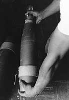 Photo #: USN 1143901 USS Turner Joy (DD-951) Crewman handles a five-inch gun projectile, during Vietnam War operations in the South China Sea, February 1970. Official U.S. Navy Photograph. Online Image: 59KB; 515 x 765 pixels Reproductions of this image may also be available through the National Archives photographic reproduction system as Photo # 428-N-1143901. |