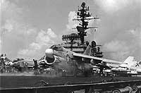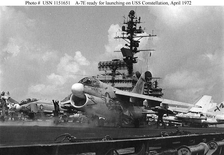 Photo #: USN 1151651 A-7E "Corsair II" attack aircraft, of Attack Squadron 146 (VA-146) On the port forward catapult of USS Constellation (CVA-64), ready for launching on an air strike mission over South Vietnam, 25 April 1972. A-7E in the right background is Bureau # 158015. It belongs to Attack Squadron 147 (VA-147). Official U.S. Navy Photograph. Online Image: 90KB; 740 x 515 pixels Reproductions of this image may also be available through the National Archives photographic reproduction system as Photo # 428-N-1151651. |