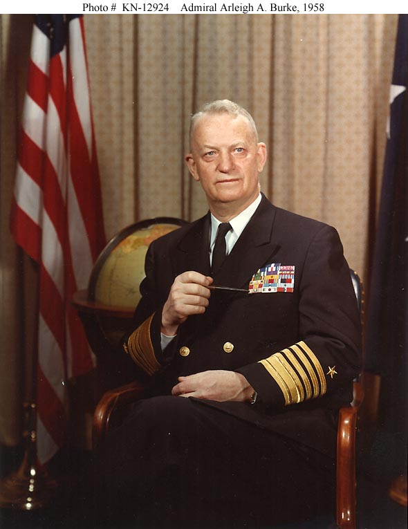Photo #: KN-12924 (Color) Admiral Arleigh A. Burke, USN, Chief of Naval Operations Portrait photograph, dated 15 December 1958. Official U.S. Navy Photograph, now in the collections of the National Archives. Online Image: 57KB; 590 x 765 pixels Reproductions of this image may also be available through the National Archives photographic reproduction system. |