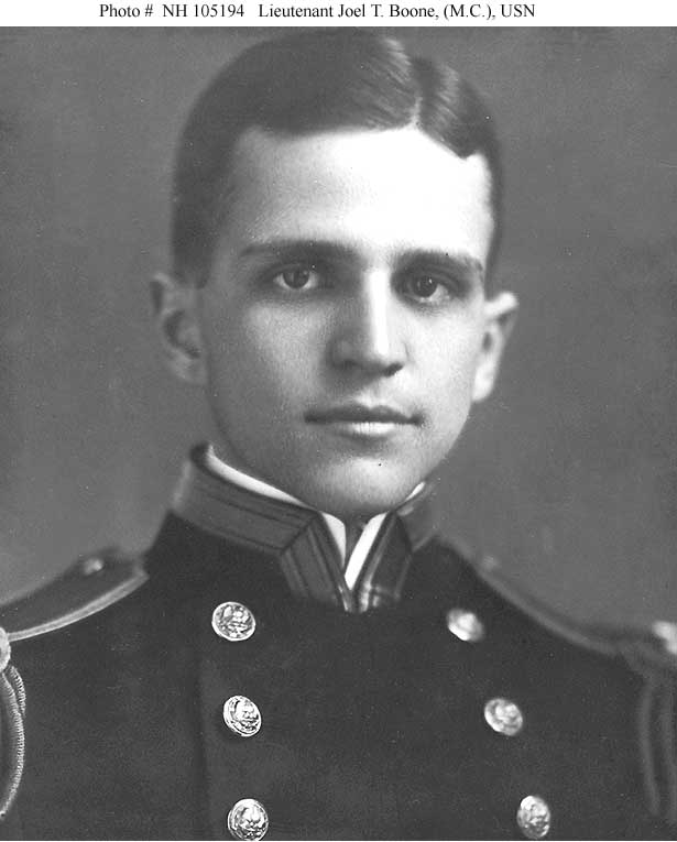 Joel Thompson Boone was born on 29 August 1889 in St. Clair, Pennsylvania. He graduated in June 1913 from Hahnemann Medical College in Philadelphia, Pennsylvania. The following spring he was appointed from that same state as a Lieutenant (Junior Grade) in the Medical Corps of the U.S. Naval Reserve. After graduate studies at U.S. Navy Medical School, Washington, D.C. in the Summer of 1915, he transferred to the Regular Navy and served with the Artillery Battalion, U.S. Marine Corps Expeditionary Force, participating in the Haiti Campaign during 1915-16. In April 1917, Boone received orders to USS Wyoming and, in June, was temporarily promoted to Lieutenant. During World War I, Boone was a Surgeon with the U.S. Marine Corps' Sixth Regiment in France. On 19 July 1918, while his regiment battled the enemy, he demonstrated "extraordinary heroism" while aiding wounded Marines. His activities at that time were recognized by the award of the Medal of Honor. In September 1918, he was temporarily promoted to Lieutenant Commander.