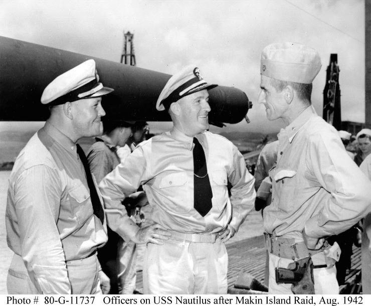 Photo #: 80-G-11737 Makin Island Raid, August 1942 Conversation aboard USS Nautilus (SS-168) after her return to Pearl Harbor from Makin Island, 26 August 1942. Those present are (from left to right): Lieutenant Commander William H. Brockman, Jr., Commanding Officer, USS Nautilus; Commander John M. Haines, Commander, Submarine Division 42, and Lieutenant Colonel Evans F. Carlson, USMC, Commander, Second Raider Battalion. Note .45 caliber M1911A1 pistol worn by LtCol. Carlson in a cross-draw holster. Official U.S. Navy Photograph, now in the collections of the U.S. National Archives. Online Image: 76KB; 740 x 610 pixels Reproductions of this image may also be available through the National Archives photographic reproduction system. |