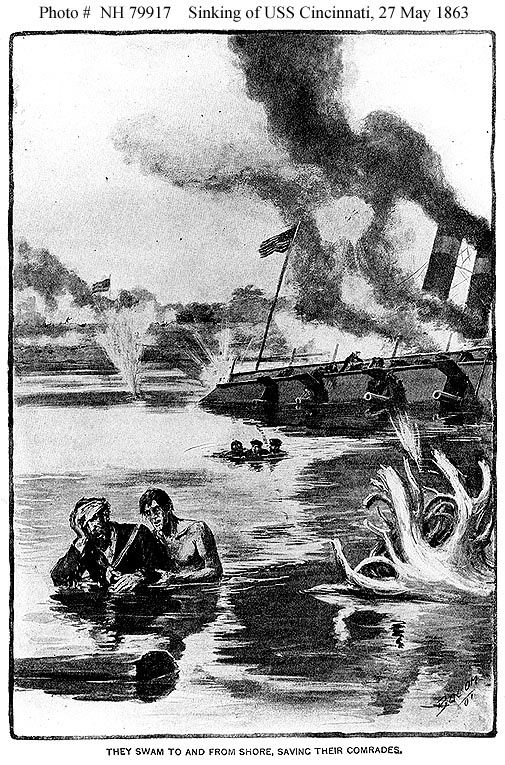 It depicts Landsman Thomas E. Corcoran assisting fellow crewmen of USS Cincinnati as their ship sinks under fire of Confederate batteries at Vicksburg, Mississippi, on 27 May 1863.