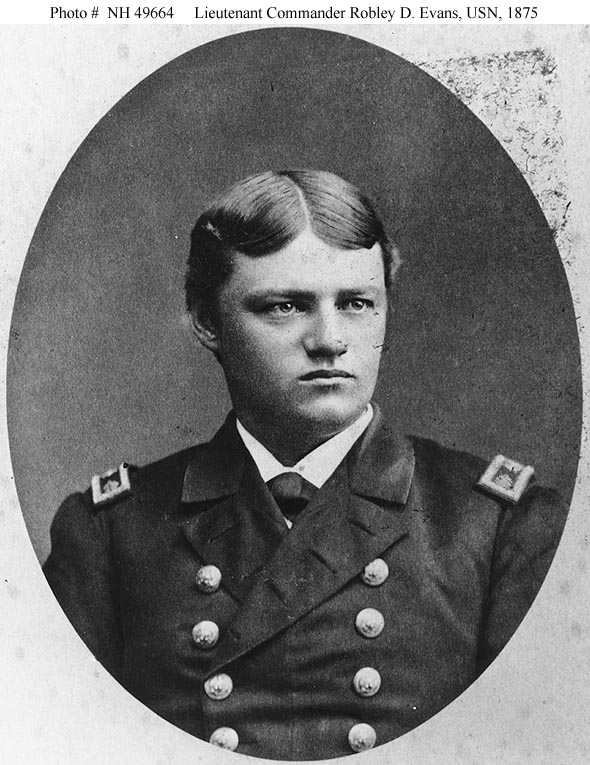Robley Dunglison Evans was born in Floyd County, Virginia, on 18 August 1846. He established residency in Utah shortly before he was appointed to the U.S. Naval Academy in September 1860. A member of the Class of 1864, he was commissioned in the rank of Acting Ensign in October 1863 and served in USS Powhatan during most of the remainder of the Civil War. Evans distinguished himself during the ground assault on Fort Fisher, North Carolina, in mid-January 1865 but was badly wounded.