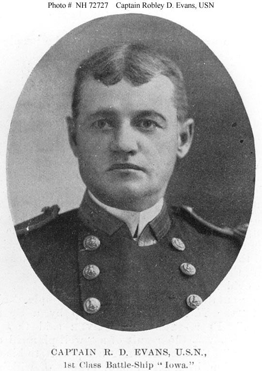 Following promotion to Captain in June 1893, Evans had further Light-House Board service and, in 1894-1897, commanded the armored cruiser New York and the new battleship Indiana. During the Spanish-American War he was given command of the battleship Iowa and performed splendidly during the 3 July 1898 Battle of Santiago. He was assigned to the Board of Inspection and Survey from October 1898 until early 1902 and was its President after his February 1901 promotion to the rank of Rear Admiral.