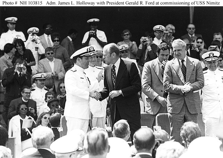 Photo #: NH 103815 Admiral James L. Holloway, III, USN, Chief of Naval Operations (left center, front) shakes hands with President Gerald R. Ford (center, front) Following the commissioning ceremony of USS Nimitz (CVAN-68) at Naval Station, Norfolk, Virginia, 3 May 1975. Also present is Secretary of Defense James R. Schlesinger (right, front). Official U.S. Navy Photograph, from the collections of the Naval Historical Center. Online Image: 95KB; 740 x 525 pixels |