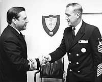 Photo #: NH 103826 Admiral James L. Holloway, III, USN, Chief of Naval Operations (left) Congratulates Master Chief Operations Specialist Robert Walker upon his selection as the next Master Chief Petty Officer of the Navy. Taken in Washington, D.C., 25 June 1975. "Master Chief Walker, 46, is a 27-year Navy veteran from Baldwin, New York, and is currently serving as Master Chief Petty Officer of the Atlantic Fleet Naval Air Force. He will relieve Master Chief John D. Whittet in September" (quoted from the original 1975 photo caption). Photographed by David Wilson. Official U.S. Navy Photograph, from the collections of the Naval Historical Center. Online Image: 67KB; 740 x 620 pixels |