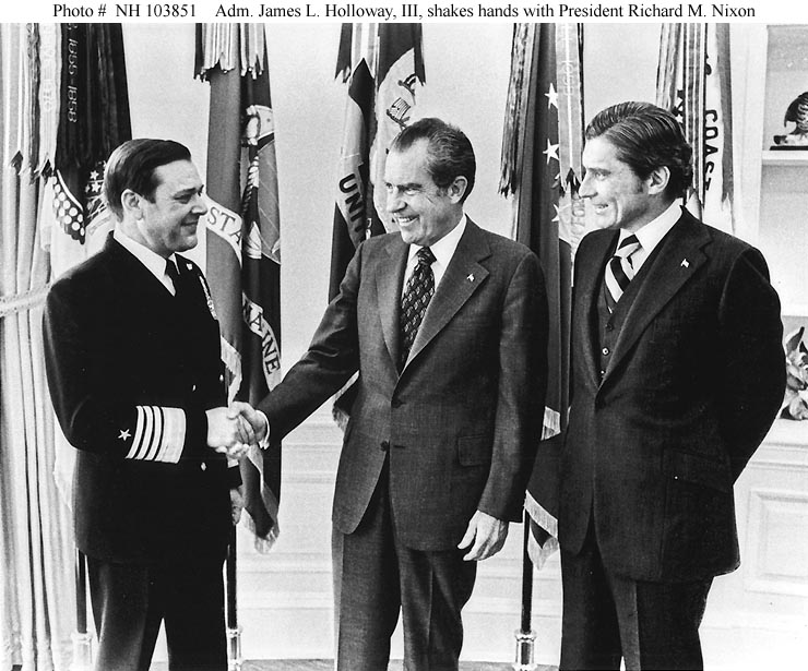Photo #: NH 103851 Admiral James L. Holloway, III, USN Shakes hands with President Richard M. Nixon, probably at the time he became Chief of Naval Operations, circa June-July 1974. Secretary of the Navy John Warner is looking on, at right. A copy of this photograph is visible in the background of Photo # NH 103814, which was taken in late July 1974. U.S. Naval Historical Center Photograph. Online Image: 99KB; 740 x 615 pixels |