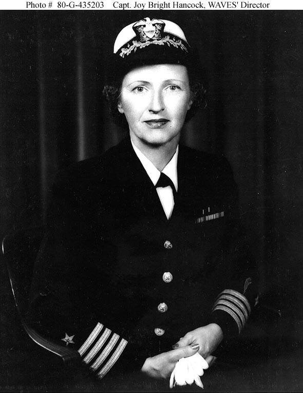 Photo #: 80-G-40428 Lieutenant Commander Joy Bright Hancock, USNR Photographed circa 1943. Official U.S. Navy Photograph, now in the collections of the National Archives. Online Image: 64KB; 595 x 765 pixels Reproductions of this image may also be available through the National Archives photographic reproduction system. |