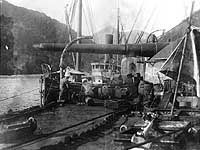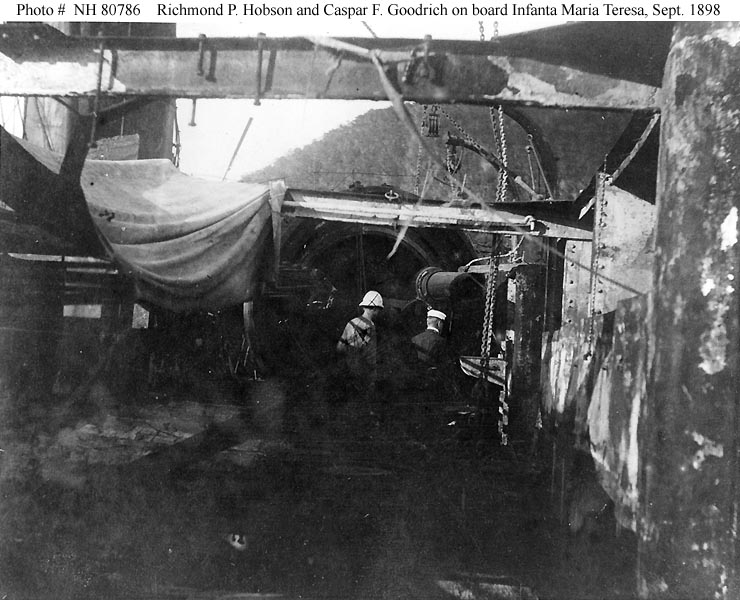 Photo #: NH 80785 Infanta Maria Teresa (Spanish Cruiser, 1890-1898) Assistant Constructor Richmond P. Hobson (in pith helmet) and Captain Caspar F. Goodrich (Commanding Officer, USS Newark) on the deck of the wrecked Spanish cruiser, while she was being salvaged, 14 September 1898. The tug I.J. Merritt is alongside. One of Infanta Maria Teresa's eleven-inch guns is also visible. Copied from the scrapbook of William D. Edwards, by courtesy of Robert W. Edwards, 1974. U.S. Naval Historical Center Photograph. Online Image: 91KB; 740 x 580 pixels |