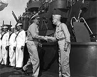 Photo #: 80-G-490425 Admiral William F. Halsey, Commander, Third Fleet (right) Welcomes Fleet Admiral Chester W. Nimitz aboard USS South Dakota (BB-57), in Tokyo Bay, 29 August 1945, after Nimitz flew in from Saipan. Both attended the Japanese surrender ceremonies on USS Missouri (BB-63) a few days later. Official U.S. Navy Photograph, now in the collections of the National Archives. Online Image: 86KB; 740 x 615 pixels Reproductions of this image may also be available through the National Archives photographic reproduction system. |