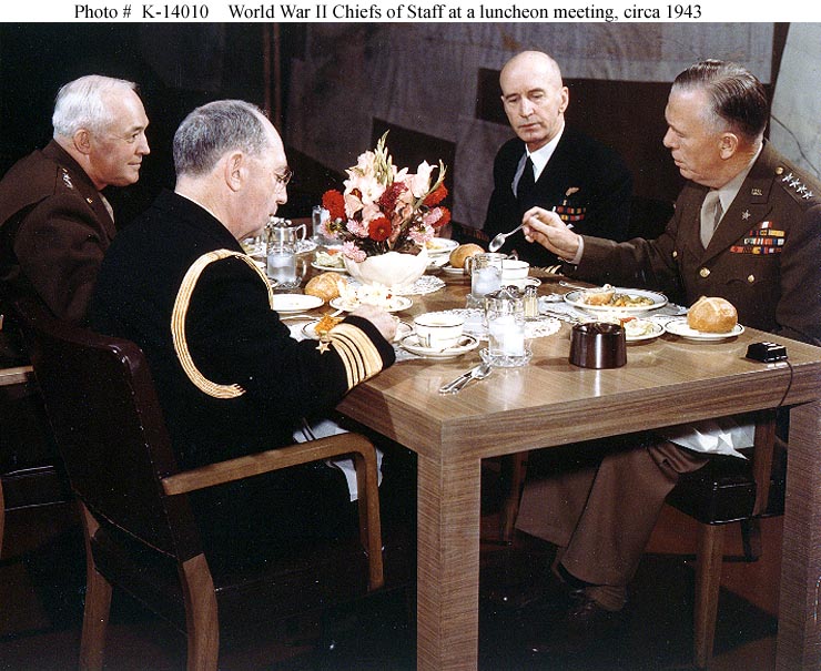 Photo #: 80-G-K-14010 (Color) World War II Joint Chiefs of Staff At a luncheon meeting, circa 1943. Present are (from left to right): General Henry H. Arnold, Chief of Staff, U.S. Army Air Forces; Admiral William D. Leahy, Chairman, Joint Chiefs of Staff; Admiral Ernest J. King, Chief of Naval Operations and Commander in Chief, U.S. Fleet; and General George C. Marshall, Chief of Staff, U.S. Army. Official U.S. Navy Photograph, now in the collections of the National Archives. Online Image: 114KB; 740 x 605 pixels Reproductions of this image may also be available through the National Archives photographic reproduction system. |