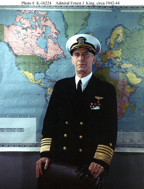 Photo #: 80-G-K-16224 (Color) Admiral Ernest J. King, USN, Chief of Naval Operations and Commander in Chief, U.S. Fleet Photographed at the Navy Department, circa 1942-44. Official U.S. Navy Photograph, now in the collections of the National Archives. Online Image: 108KB; 585 x 765 pixels Reproductions of this image may also be available through the National Archives photographic reproduction system. |