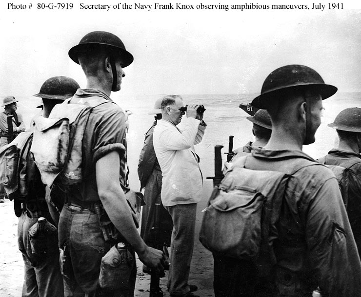 Photo #: 80-G-7919 Secretary of the Navy Frank Knox (center) Standing with a group of U.S. Marines, while observing joint maneuvers at New River Inlet, North Carolina, circa 17 July 1941. Note combat gear worn by the Marines and bow of beached landing craft in the right center background. Official U.S. Navy Photograph, now in the collections of the National Archives. Online Image: 91KB; 740 x 610 pixels Reproductions of this image may also be available through the National Archives photographic reproduction system. |