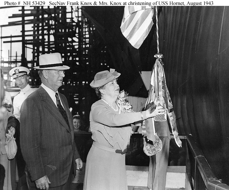 Photo #: NH 53429 USS Hornet (CV-12) Secretary of the Navy Frank Knox and Mrs. Annie Reid Knox, the ship's sponsor, at Hornet's christening ceremonies, 30 August 1943. The carrier was built at the Newport News Shipbuilding and Dry Dock Company shipyard, Newport News, Virginia. U.S. Naval Historical Center Photograph. Online Image: 96KB; 740 x 615 pixels |