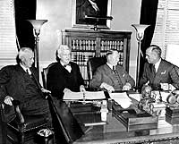 Photo #: NH 81942 Secretary of the Navy Frank Knox (right center) Confers with Admiral James O. Richardson (right), Commander in Chief, U.S. Fleet, in the Secretary's Office, Washington, D.C., on 10 October 1940. Also present are Admiral Harry E. Yarnell, USN(Retired) (left) and Admiral Harold R. Stark, Chief of Naval Operations. Admiral Richardson was in Washington to protest the continued basing of the U.S. Fleet at Pearl Harbor. Collection of Admiral Harold R. Stark. U.S. Naval Historical Center Photograph. Online Image: 125KB; 740 x 620 pixels |