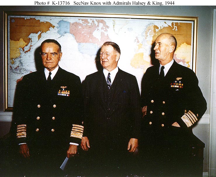 Photo #: 80-G-K-13716 (Color) Admiral William F. Halsey, USN (left) With Secretary of the Navy Frank Knox (center) and Admiral Ernest J. King at the Navy Department, Washington, D.C., in January 1944. He had just been presented with a gold star in lieu of a second Distinguished Service Medal. Official U.S. Navy Photograph, now in the collections of the National Archives. Online Image: 109KB; 740 x 605 pixels Reproductions of this image may also be available through the National Archives photographic reproduction system. |