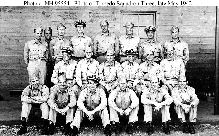 Photo #: NH 95554 Torpedo Squadron Three (VT-3) Squadron pilots, photographed Naval Air Station, Kaneohe, Hawaii, in late May 1942, just before the Battle of Midway. Most of these men lost their lives in that action. Those present are identified in Photo # NH 95554 (Complete Caption). Courtesy of Captain John W. Myers, USN(Retired), 1985. U.S. Naval History and Heritage Command Photograph. Online Image: 131KB; 740 x 460 pixels |