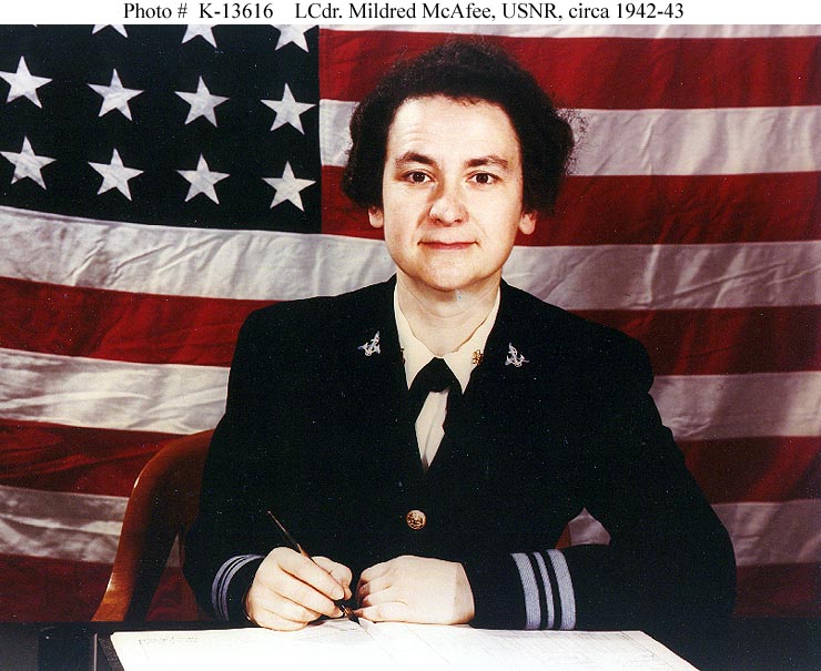 Photo #: 80-G-424329 Lieutenant Commander Mildred H. McAfee, USNR, Director of the WAVES Portrait photograph, taken in 1942-43. Official U.S. Navy Photograph, now in the collections of the National Archives. Online Image: 80KB; 590 x 765 pixels Reproductions of this image may also be available through the National Archives photographic reproduction system. |