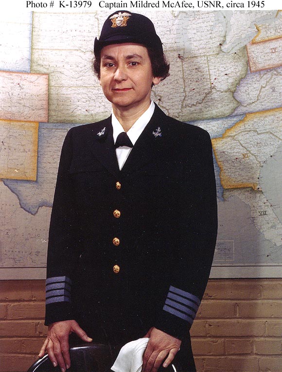 Photo #: 80-G-K-13979 (Color) Captain Mildred H. McAfee, USNR Photographed circa 1945. She was the wartime Director of the Women's Reserve ("WAVES"). Official U.S. Navy Photograph, now in the collections of the National Archives. Online Image: 110KB; 580 x 765 pixels Reproductions of this image may also be available through the National Archives photographic reproduction system. |